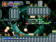 Bangai-O is a 2D side-scrolling multidirectional shooter.[1] The player controls a weaponized mech that is piloted by the two main characters, Riki and his sister Mami. The story follows Riki and Mami in their efforts to stop criminals from smuggling fruit contraband to finance their evil deeds.[2] The player can fly freely around each of the game's 44 stages, and must find and destroy the boss in each stage to advance.[3][4] The mech can shoot in eight directions, and the type of ammo is dependent on which character is piloting. The two pilots can be interchanged instantaneously, Riki fires homing missiles and Mami shoots reflecting projectiles which bounce off walls.[1][2] The stages are populated with destroyable buildings and obstacles, as well as some walls that are opened by switches.[1][3] There are also hazards such as gun turrets and enemy mechs which fire projectiles at the player. The player has a health meter but no brief invulnerability period after being hit, so can die instantly if hit with a barrage of fire.[4] Destroyed enemies and objects yield fruit which replenishes a meter that is used to power the "scatter bomb" attack.[1][5] This attack can be charged to release up to 100 shots scattered in all directions at once. Hitting all 100 shots on enemies will open a small portal to a shop where the player can get upgrades such as improved shot damage.[4]