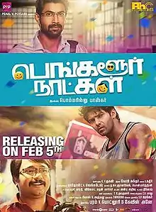 Bangalore Naatkal (transl. Bangalore Days) is a 2016 Indian Tamil-language comedy drama film directed by Bommarillu Bhaskar, which is a remake of the 2014 Malayalam film Bangalore Days written and directed by Anjali Menon. Featuring an ensemble cast consisting of Sri Divya, Bobby Simha, Arya, it tells the story of three cousins who live their childhood dream of living and enjoying in the city of Bangalore. It also stars Rana Daggubati, Parvathy Thiruvothu (who reprises her role from the original), Raai Laxmi, Paris Laxmi, Prakash Raj in other pivotal roles. Samantha Ruth Prabhu appears in a cameo. Produced by Prasad V Potluri under his banner PVP cinema, the film released on 5 February 2016. Unlike the original, this movie received mixed reviews and failed at the box office with critics and fans drawing comparisons with the original.