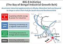 The Bay of Bengal Industrial Growth Belt Big B is a dream of the late Japanese Prime Minister Shinzo Abe which is a long-term plan to strengthen the existing partnership between Bangladesh and Japan.This plan came to the mind of Prime Minister Shinzo Abe around Matarbari. During Prime Minister Shinzo Abe's visit to Dhaka in 2014 initial talks with Bangladesh Prime Minister Sheikh Hasina and Bangladesh and Japan agreed to implement this plan.[6]