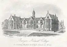 The Normal College, Bangor (Welsh: Y Coleg Normal) was an independent teacher training college, founded in 1858.[1] It was created through the efforts of the British and Foreign School Society and the educator Sir Hugh Owen, and was funded by £11,000 raised through subscription and £2,000 of Government money. Teaching began on temporary premises in January 1858 and the College opened on its permanent site in 1862.[1] In 1979 it changed its name to Y Coleg Normal, Bangor or in English: The Normal College, Bangor and in 1996 it became part of University of Wales Bangor.