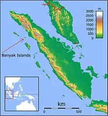 The Banyak Islands (sometimes spelled Banjak Islands) are a group of inhabited islands located between Simeulue and Nias off the western coast of Sumatra in Indonesia's Aceh Province. Surveys of the area approximate around 71 islands and additional mangrove stands in shallow off-shore areas, although locals count 99 islands.[1] The largest island in the group is Tuangku, with the principal village of Haloban on its southwest coast. Two other major islands located either side of Tuangku are Bangkaru (uninhabited) to the southwest, and Ujung Batu or Banjak Island to the northeast. Tuangku is separated from Bangkaru by a fault line.