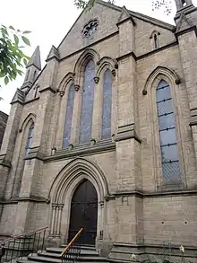 The original Bank Street building, from Seddon's gift in the 1600s, was T-shaped but was replaced in 1856 by a George Woodhouse-designed structure, incorporating three pew doors from the original.[12]