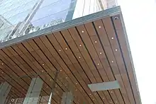The Bank of America Tower's curtain wall was specifically designed to meet LEED standards, allowing natural light into the lobby and offices during the daytime.[32] Above the main entrance on 42nd Street and Sixth Avenue is an installation of building-integrated photovoltaics (BIPVs), which produce small amounts of energy for the building.[52] Some spandrels on the eastern facade also contain BIPVs.[19] The southeast-corner chamfer is designed with a double-glazed wall,[52] which deflects sunlight during the summer.[47][48] The double-insulated curtain wall panels cover 20,825 square feet (1,934.7 m2). The curtain wall allows 73 percent of visible light to enter but deflects all ultraviolet rays. The curtain wall design keeps heat out of the building during summer and keeps heat inside during winter.[53] Above the main entrance, there is an oxidized-bamboo canopy.[42][54] Extending 25 feet (7.6 m) outward from the lobby, the entrance canopy continues indoors as the ceiling of the lobby.[54]