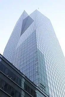 The building contains a seven- and eight-story base that occupies the entire plot.[8][23] The tower rises above the eastern portion of the plot, covering 32,500 square feet (3,020 m2).[9] The facade contains several diagonal planes, which are designed to reduce wind resistance compared to a rectangular massing.[41] Serge Appel of Cookfox said the tower's massing would conform with Bank of America's wish for "an iconic form"[42] and would maximize views of other buildings.[43][44] One section of the building has a roof garden covering 4,500 square feet (420 m2).[45] The building's three basement levels reach as deep as 55 feet (17 m) below grade.[9]