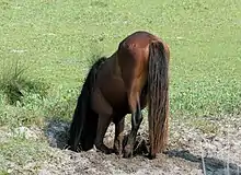 Fresh water is a limiting resource for Bankers, as the islands are surrounded by salt water and have no freshwater springs or permanent ponds.[18] The horses are dependent on ephemeral pools of rainwater and moisture in the vegetation they consume.[20] Bankers will dig shallow holes, ranging from 2.5 to 4 feet (0.76 to 1.22 m) in depth, to reach fresh groundwater.[18] Occasionally, they may resort to drinking seawater. This gives them a bloated appearance, a consequence of water retention caused by the body's effort to maintain osmotic balance.[22]