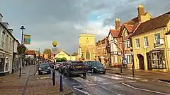 Shefford grew up between a pair of fords on the main road from Bedford to Hitchin where it crosses the River Flit and River Hit. Another road leading west from that main road, heading towards Ampthill, became the town's High Street. Both fords were later replaced by bridges; North Bridge over the Flit and South Bridge over the Hit. A market was being held at Shefford by 1225, with a formal market charter being issued in 1229.[5] By the fifteenth century the church of St Michael and All Angels had been built at the eastern end of the High Street near the junction with Southbridge Street, originally serving as a chapel of ease to Campton.[6][7]