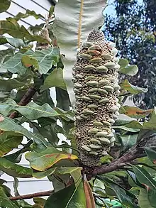 The tropical banksia is generally a small tree which grows to around 4 m (13 ft) or sometimes up to 7 m (23 ft) tall,[4] with a rough stocky trunk, spreading crown,[5] and crooked branches.[6] The dark grey bark is not flaky but tesselated in texture and appearance.[5][6] Initially covered in reddish hair that wears away, branchlets become smooth and grey with age. The large green leaves are scattered along the stems, and more crowded at the branchlet tips. They are 9–22 cm (3.5–8.7 in) long and 2–9 cm (0.79–3.54 in) wide, obovate in shape with mucronate tips. The dentate (toothed) margins are lined irregularly with 0.1–1.3 cm (0.039–0.512 in) long teeth, separated by u-shaped sinuses. The leaves are undulate (wavy) with white undersurfaces, the midrib raised underneath and depressed above. The cylindrical yellow inflorescences (flower spikes), arise from one- to three-year-old branches.[5] Appearing between November and May, they are 10 to 13 cm (3.9 to 5.1 in) high and 5 to 10 cm (2.0 to 3.9 in) wide. Newly opened flower spikes smell like corn.[6] All flower parts are pale yellow; the perianth is 2.5–3.2 cm (0.98–1.26 in) long, including a 0.5 cm (0.20 in) long limb. After anthesis, the pistil is 3.1–4.6 cm (1.2–1.8 in) long. Flower parts soon fall off ageing spikes, which develop into irregular-cylindrical infructescences. The oval follicles are 1.5–2 cm (0.59–0.79 in) long, 0.4–0.8 cm (0.16–0.31 in) high and 0.5–0.8 cm (0.20–0.31 in) wide. Pale green and furry when young, they become smooth and pale brown with age. The follicles open spontaneously with maturity.[5] They contain two seeds each, between which lies a woody dark brown separator of similar shape to the seeds. Measuring 1.8–2.1 cm (0.7–0.8 in) in length, the seed is obovate, and composed of a dark brown 1.1–1.4 cm (0.4–0.6 in) wide membranous 'wing' and obovate seed proper which measures 1.0–1.2 cm (0.4–0.5 in) long by 0.5–0.8 cm (0.2–0.3 in) wide. The seed surface can be smooth or covered in tiny ridges.[5]