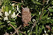 Flowering has been recorded between January and October, with a peak in autumn and early winter (April to June).[6] The inflorescences, or flower spikes, arise from the end of 1 to 5 year old branchlets, and often have a whorl of branchlets arising from the node or base. Measuring 5–15 cm (2.0–5.9 in) high and 4 cm (1.6 in) wide, the yellow spikes often have blue-grey tinged limbs in bud,[3] though occasionally pinkish, mauve or mauve-blue limbs are seen.[7] Opening to a pale yellow after anthesis, the spikes lose their flowers with age and swell to up to 17.5 cm (6.9 in) high and 4 cm (1.6 in) wide, with up to 80 follicles. Covered with fine fur but becoming smooth with age, the oval-shaped follicles measure 1–1.8 cm (0.39–0.71 in) long by 0.2–0.7 cm high (0.1–0.3 in) and 0.3–0.7 cm (0.12–0.28 in) wide.[3] The bare swollen spike, now known as an infructescence, is patterned with short spiky persistent bracts on its surface where follicles have not developed.[5] Each follicle contains one or two obovate dark grey-brown to black seeds sandwiching a woody separator. Measuring 1.2–1.8 cm (0.47–0.71 in) long, they are made up of an oblong to semi-elliptic smooth or slightly ridged seed body, 0.7–1.1 cm (0.28–0.43 in) long by 0.3–0.7 cm (0.12–0.28 in) wide. The woody separator is the same shape as the seed, with an impression where the seed body lies next to it.[3] Seedlings have bright obovate green cotyledons 1.2–1.5 cm (0.47–0.59 in) long and 0.5–0.7 cm (0.20–0.28 in) wide, which sit on a stalk, or 1 mm diameter finely hairy seedling stem, known as the hypocotyl, which is less than 1 cm high. The first seedling leaves to emerge are paired (oppositely arranged) and lanceolate with fine-toothed margins, measuring 2.5–3 cm long and 0.4–0.5 cm wide. Subsequent leaves are more oblanceolate, elliptic (oval-shaped) or linear. Young plants develop a lignotuber in their first year.[3]