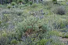 This banksia grows in or near heath in shallow soil near granite outcrops. It is only known from five populations in the Monadnocks Conservation Park and Wandering Conservation Park.[2]