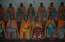 The settlement is completely encircled by a fortified stone wall, much like Chengde Mountain Resort. The main entrance is Nantianmen (南天门; 南天門; 'Southern Heavenly Gate'). Inside the wall there are several important cultural sites, which have earned Baodu Zhai a national AAAA rating as a scenic spot, as well as a large area of vegetation and gardens. These sites include the Hall of 500 Luohan, which is a large underground chamber containing 500 carved stone luohan, each in a different pose, and presided over by three golden Buddhas.