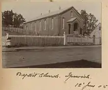 The congregation built its first church in August 1860: a small chapel constructed in the West Street garden of the church's first pastor, Rev. Thomas Deacon (he died shortly before the chapel's opening).[9][10] In the mid-1870s, after Rev. J. Straughen took office, the congregation experienced a surge in numbers growing from 38 in August 1875 to 78 in December 1876. During 1876 it became clear that the West Street chapel was too small, and the decision was made to erect a new church building. The Rev. Deacon's widow generously gifted the first chapel, and its site including the house, to the church trustees on the condition that they were used by them in Ipswich. Ultimately that property was sold and another on the main street of town was purchased for a new church.[1][11]:38–39