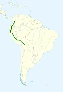 The bar-bellied woodpecker's subspecies equifasciatus is the northernmost; it is found from Colombia's central Andes south through Ecuador and into northern Peru's Amazonas Department. Subspecies pectoralis is found on the eastern slope of the Peruvian Andes from Amazonas to Junín Department. The nominate subspecies is found on the east slope of the Andes from Junín in Peru to central Bolivia's Cochabamba and Santa Cruz departments.[2][7]