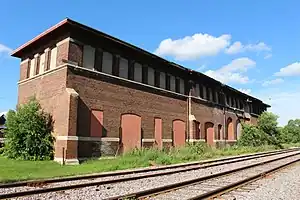 Baraboo station, otherwise known as the Baraboo Chicago & North Western Depot and Division Offices is a former railway station in Baraboo, Wisconsin, built be the Chicago and North Western Railway (C&NW). The depot served both passengers and freight traffic as well as housing the Madison Division offices of the C&NW. The Madison Division covered a 219-mile (352 km) line from Belvidere, Illinois to Medary, Wisconsin. The depot was designed by the team of Frost and Granger, who designed more than 200 depots for the C&NW. This particular depot was built in the Romanesque Revival style.[1] Passenger service to the depot ended in 1963 with the elimination of the Rochester 400. As of 2022, the Sauk County Historical Society hopes to restore the depot into a museum and community gathering space.[2][3]