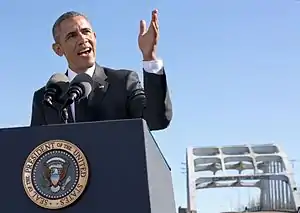 The formal writing process for the speech began on February 25, working closely with speechwriter Cody Keenan.[3] In preparation, Keenan had read works by Taylor Branch and had been watching speeches by Rep. John Lewis. A few days earlier, former New York Mayor Rudy Giuliani had made remarks about whether President Obama loved America, leading Keenan to suggest that the speech focus on patriotism.[4] The first draft was completed on March 5, two days before the address, and Obama instructed Keenan to add references to Ralph Waldo Emerson and Walt Whitman.[4] The speech went through five drafts before March 7,[3] with Obama still making tweaks on the flight to Alabama.[4]