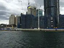 The Barangaroo area, which had been a derelict port for years, had been a long-proposed site for urban renewal. Following proposals put forward by the Sydney Harbour Foreshore Authority and reviews by the O'Farrell State Government, major construction and redevelopment at Barangaroo began in 2011.[3] In May 2013, the State Government outlined plans to build a new terminal at Barangaroo to replace Darling Harbour.[4] As well as allowing for additional services on the F3 Paramatta River route, the increased capacity will allow other routes, such as a then-envisioned potential extension of the F7 Eastern Suburbs route, to also use the new wharves.[5] It was proposed that all Sydney Ferries routes that used the Darling Harbour wharf will be rerouted to Barangaroo, with Darling Harbour to be decommissioned and handed back to private operation.[6]