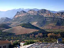 - to the south: along the ridgeline through Monti Rossi (674 m), crossing the D38 road south of an old quarry before dropping rapidly towards the plain to join the Monte Sant'Angelo limestone hills 300 m to north of the mountain;