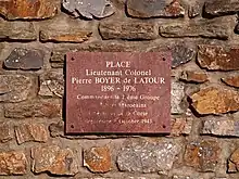 - The War memorial is represented by a commemorative plaque on the wall of the "Lieutenant Colonel Pierre Boyer de Latour" Square.