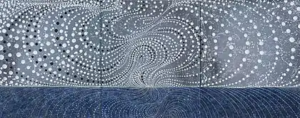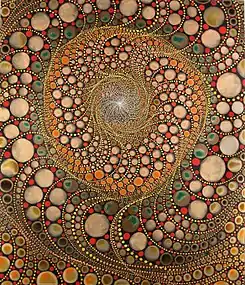 In the 1990s, Takenaga turned to enormous (often twenty-foot-long) acrylic paintings constructed from hollow wooden doors, which used enigmatic abstract shapes and symbols drawn from science, logic and classical Eastern art.[44][20][23] The Long Resonance (1991) is a representative work; it features a cloud-like expanse breaking into a dark, rectangular ground decorated with icons, silhouettes (animals or Japanese figures) and garlands of red, dotted lines that presage her future paintings.[23][44] In subsequent work, she dramatically reduced her scale to intimate (12 in × 9 in (300 mm × 230 mm)) abstractions eliminating signage and recognizable elements.[23] Nevus (1997) and Tortuca (1998) employ whimsical, intricate spirals overlaid on modulated grounds of beige and brown.[45][14] Inspired by an offhand observation of spiraling tufts of hair on her dog, these forms evolved into Takenaga's mature work when she began painting variations on darkened backgrounds, evoking celestial phenomena.[46][24]