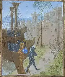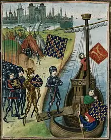 ![]() The French army disembarking in Africa, led by the Duke of Bourbon, holding a shield bearing the royal arms of France (15th century miniature) | |||||||||