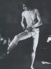 He returned to America in 1924 to appear in The Passing Show of 1924 which ran for four months beginning in September.[13][18] Also in this timeframe he became a featured attraction with Ringling Bros. and Barnum & Bailey Circus and toured London, Brussels and Berlin.[13] It was during an engagement at the London Palladium that Barbette was found engaged in sexual activity with another man. His contract was cancelled and he was never able to obtain a work permit for England again.[19][20]