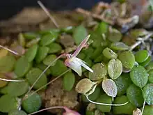 Barbosella crassifolia is a miniature sized, warm to cool growing, mat forming epiphyte with ascending ramicauls enveloped by a thin, tubular sheath and carrying a single, apical, prostrate, thickly coriaceous, suborbicular to elliptical, entire apically, obtuse rounded, rounded and contracted below into the nearly absent petiolate base leaf that blooms in the late winter and early spring on a slender, erect, 0.6 to 1.12" [1.5 to .8 cm] long, solitary flowered inflorescence with a minute bract below the middle and an oblique floral bract.