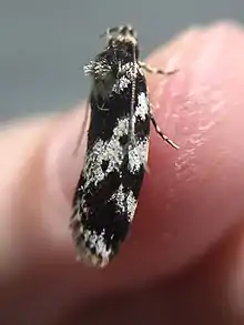 The wingspan is about 20mm. The forewings have a black and white pattern. The hindwings are silky fawn.