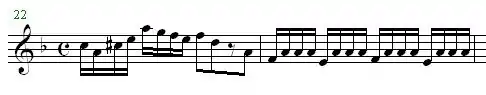 In this passage, the repeated A is played on the open A string, alternating with Fs and Es fingered on the adjacent D string. The notes on the D string (E and F natural) would be fingered as normal (first finger and low second), but the fingerings given above the second measure would be [2040 1040 2040 1040], indicating the switch (bariolage) from open A string to the stopped fourth finger on the D string, also playing the note A.