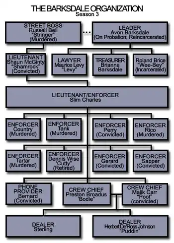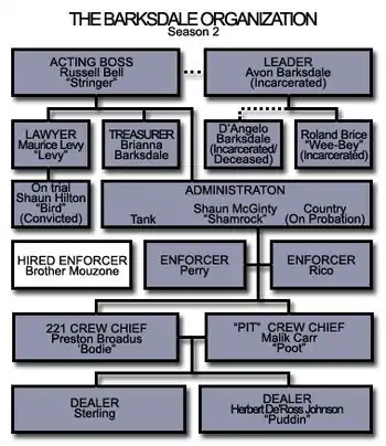 The Barksdale Organization is a fictional drug-dealing gang on the television series The Wire. Many of the characters featured in season one of The Wire belong to this organization. Season 1 largely deals with the Baltimore Police Department setting up a Major Crimes Unit to investigate the Barksdale Organization, led by Avon Barksdale who is portrayed as the most powerful drug kingpin in Baltimore.