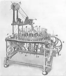 A. Spindle set in top plate B. Yarn threaded up to mandrill C. Beater dome C1. Beater knives D. Mandrill (variable settings) E. Finished Lace F. Jacquard G. Pulley for drive belt H. Hand wheel K. Beater cams L. Take-up rolls M. Handle to engage drive belt