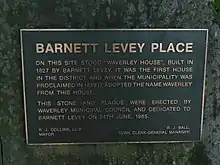 Barnett Levey built Waverley House in 1827, the first house in the Waverley district. Following Levey's death, the house served as a convent and subsequently as a school for destitute girls and later as a boys' school before it was demolished in 1904.[7] Waverley House gave its name not only to the Municipality, but also to the Suburb, Street, Crescent and Lane.[8]
