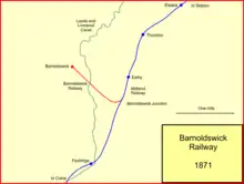 The Barnoldswick Railway was an English railway company, that constructed a short branch line to Barnoldswick[note 1] from a junction on the Midland Railway line from Skipton to Colne. It was opened in 1871, and was worked from the outset by the Midland Railway. It was moderately successful in financial terms, and the company was acquired by the Midland Railway in 1899.