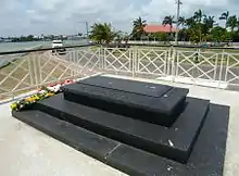 Bliss's health appeared to improve over the next few weeks, and he spent much of this time sailing around the area in his launch, exploring the coastline and fishing. However, just days before his 57th birthday, his health took a turn for the worse, and doctors advised him that he was terminally ill. It was at this time that he decided he would leave the bulk of his fortune to the country, and signed a new draft of his will, dated 17 February. Several weeks later, he died on his yacht, never having landed on the Belize mainland. He was buried in the former site of a Spanish fortress which was extremely damaged after the Battle of St. George's Caye in September 1798 in Belize City, what is now known as Bliss Park. This was a temporary arrangement, and he was later interred in a granite tomb near the sea, with a lighthouse nearby, built with funds from his estate.[1] The burial instructions were explicitly stated in the will.[8]