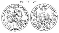 The seals appended by hempen cords to Exemplar B were "tricked" (i.e. reproduced by drawing) by Lancaster Herald Nicholas Charles in 1611.[8] He also made a transcript of Exemplar B., which clearly was then in a better state of preservation than today.[9] Whilst his drawings provide much detail which is otherwise difficult to see in photographs of the seals themselves, some of his transcripts of the legends are inaccurate.[10]