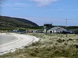 Barra Airport (Scottish Gaelic: Port-adhair Bharraigh) (IATA: BRR, ICAO: EGPR) (also known as Barra Eoligarry Airport) is a short-runway airport (or STOLport) situated in the wide shallow bay of Traigh Mhòr at the northern tip of the island of Barra in the Outer Hebrides, Scotland. The airport is unique, believed to be the only one in the world where scheduled flights use a tidal beach as the runway.[3][4] The airport is operated by Highlands and Islands Airports Limited, which owns most of the regional airports in mainland Scotland and the outlying islands. Barra Airport opened in 1936.[5] The airport's only destination is Glasgow.[6]
