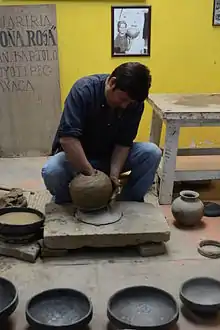 This style of pottery is made in San Bartolo Coyotepec and a large number of small communities in the surrounding valley, where the clay that gives it its color is found.[5][11] This community is located 11 kilometres (6.8 mi) south of the city of Oaxaca,[5] with about 600 families in the area dedicated to the craft.[4] In addition to a number of family workshops, including Doña Rosa's, the Mercado de Artesanias is an important attraction which brings visitors from many parts of Mexico and other countries. A group of fourteen people exhibit and sell barro negro objects. Some of these products include vases, animal figures and jars. Demonstrations of pottery making are held there as well.[12] In 2005, the Museo Estatal de Arte Popular de Oaxaca (State Museum of Popular Art) was opened here. It has one of its three halls dedicated to barro negro, with pieces from the Monte Albán era to the present day.[4] In 2009, San Bartolo Coyotepec held its first Feria Artesanal de Barro Negro (Crafts Fair of Barro Negro) with the participation of over 150 artisans.[13]