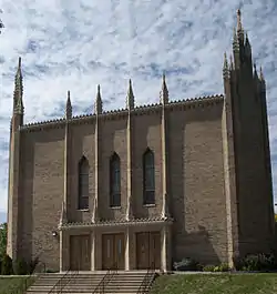 Church of Saint Francis Xavier, Kansas City, Missouri by Barry Byrne (1949), called the "fish church" because of its plan, with statuary by Alfonso Iannelli and stations of the cross by Annette Cremin Byrne; recipient of the American Institute of Architects retrospective award for design excellence in 1987