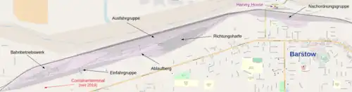 The Barstow Yard extends above the town of Barstow for almost 5 miles (8.0 km) along the Mojave River and occupies an area of about 600 acres (240 ha). Following the flow of traffic, the track systems of the flat station are divided from west to east into the following track groups: the arriving freight trains are directed into the entry group (approx. 10 tracks) in the west; the mainline locomotives (line haul) are replaced here by shunting locomotives (switchers), which move the trains to the drainage mountain and push the freight cars into the eastward classification bowl (48 tracks) in the center; here, the freight cars are put together into new trains, which are then transported to the departure yard (approx. 10 tracks) in the east; these tracks are used to change direction to the exit group (approx. 15 tracks) above the direction harp (pull-out tracks); before leaving, mainline locomotives take over the final trains again, where in the classification yard several locomotives are usually combined into consists.[8]