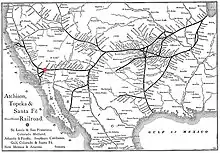 By 1867, the Southern Pacific Railroad (SP) had completed the western portion of the first transcontinental railroad link between San Francisco and Omaha, Nebraska, and expanded into southern California in the 1870s. Soon after, a spur was built from Los Angeles to Yuma on the Colorado River in Arizona. A line from Mojave, California through the desert to Needles, California, about 124 miles (200 km) north of Yuma on the Colorado River, was also built, connecting the planned Atlantic and Pacific Railroads between Missouri and California. The western section ran east to Isleta, New Mexico. After 1880, the California Southern Railroad created a line from San Diego in the south via San Bernardino to the SP line in today's Barstow, about 60 miles (97 km) east of Mojave.[1] The intersection was called Waterman Junction after the governor of California Robert Waterman, who ran a ranch and operated several silver mines in the area.[2][3] During the second phase of the Great Depression from 1873 to 1896, the western part of the never-completed Atlantic and Pacific, between Needles and Isleta, was reorganized as a subsidiary of the AT&SF, which operated its network, thereby widened, westward through Isleta to Needles; the eastern portion became part of the St. Louis-San Francisco Railway. AT&SF also acquired the section through the Mojave Desert from SP and reached the west coast through its subsidiary, California Southern Railroad.[4] Waterman Junction was named in 1886 by the president of the AT&SF William Barstow Strong[5][6] in Barstow.