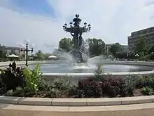 The Fountain of Light and Water,[2] commonly called the Bartholdi fountain, was created for the 1876 Philadelphia Exposition which celebrated the 100th birthday of the United States. It was designed by French sculptor Frédéric Auguste Bartholdi, and it was cast by the Durenne foundry in France, which had won awards for its cast-iron fountains at earlier international expositions in 1862, 1867 and 1873.[3] Bartholdi offered the fountain to the Exposition for free; he intended to sell it afterwards, and to sell others of the same design to other cities. The fountains stood at the center of the esplanade, near the main entrance to the exposition.