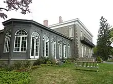 The house is oriented on a north-south axis,[6] with wings on either side.[126] The facade is made of plain cut stone,[129] which was sourced from the surrounding area.[52] The exterior walls are at least 2 feet (0.61 m) thick, allowing the mansion to remain cool even during the summer.[6] There is a painted cornice at the top of the facade, as well as beveled quoins at each corner.[129]