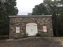 The carriage house was built no later than 1842 and is the last remaining outbuilding on the Bartow–Pell Mansion's site.[102][135] It is also the last remaining masonry carriage house in New York City that retains its original design.[135] The three-story building was built into the slope of a hill, making it appear two stories tall on one side.[135][3] Although it was common for mid-19th-century carriage houses to be built on hillsides, the hill surrounding the Bartow-Pell carriage house is artificial, with downward slopes to the north, east, and south.[136] The stable was constructed of the same locally-sourced stone as the main mansion. On the front or west facade is an elliptical brick arch flanked by a rectangular window with a brick frame and stone lintel.[3]
