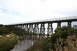 From Anderson to Kilcunda the trail drops 40 metres (130 ft) in height as it winds down through farming country. Here, the gravel path is overgrown and trail users need to negotiate several gates. The rail trail at Kilcunda is built on the coastal sand dunes and incorporates a landmark trestle bridge over Bourne Creek. Path users have panoramic scenic views of the Bass Strait coast and the Wonthaggi Wind Farm that was erected during 2005.