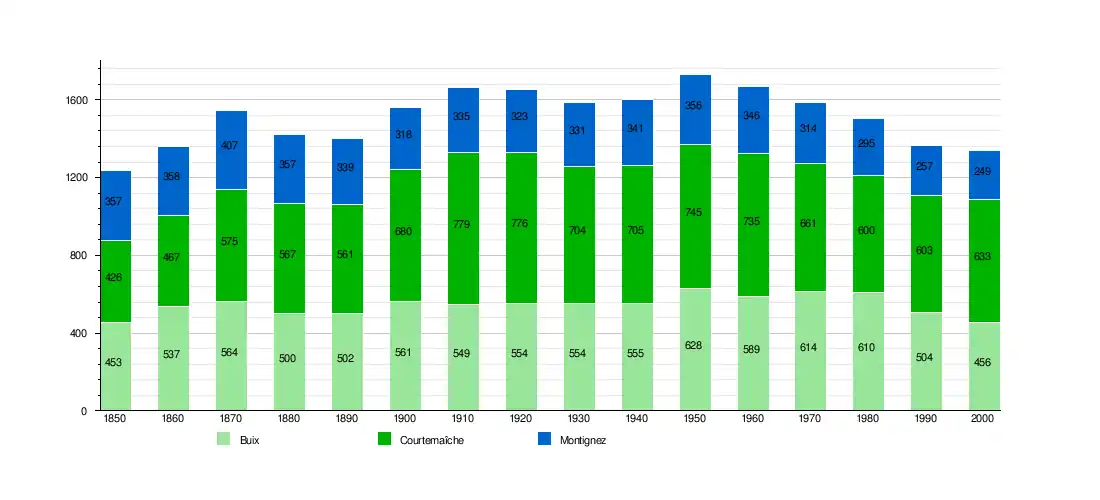 Buix is first mentioned in 1136 as Bus.[4] Courtemaîche is first mentioned in 1139 as Cordomasge.[5] Montignez is first mentioned in 731 as Montaniaco.[6]