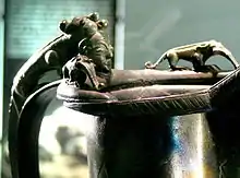 Etruscan flagon; note the two reclining animals on the rim.