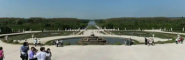 The fountain was begun in 1670 by André Le Nôtre, then enlarged and modified by Jules Hardouin-Mansart in 1686.[4] In 1667 the sculptor brothers Gaspard and Balthazard Marsy were employed to embellish the basin with statuary. Balthazard created six lead half-human, half-frog sculptures placed around the perimeter of the basin, and between 1668 and 1670 Gaspard created the main statuary group of Latona with Diana and Apollo. The statue was placed on a low foundation of rocks at the center of the fountain, from where Latona faced eastwards toward the palace.[5]