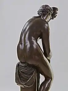 To enhance the erotic attraction of the female nude, the artist has contrived that the goddess hides her face behind her raised arm holding up a vessel, with which she is pouring water on her body. With the other hand she cleans herself with a handkerchief. The viewer can approach her without entering her line of sight and, when in front of her, there is a moment of reciprocal discovery. The motif of the raised left leg is an allusion to the typology of the ancient Venus removing her sandals. Not only does Giambologna borrow from ancient Venuses the game of simultaneously hiding and revealing, his bronze Bathing Venus manifests a particular delight in the indiscreet observation of the female nude matching the courtly taste of the late Renaissance.[8]