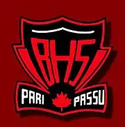 The school crest is a black shield with red edging bearing the school's initials ("BHS") stylised across the central face of the shield, written in red, with a white line that follows the top contour above the initials, and a red maple leaf below the initials, bearing the Latin motto Pari Passu in white in a scroll-like space, in the base of the shield, and included within the unbroken red edging that marks the perimeter of the crest. The shield appears to get larger about halfway down, and the expansion is occupied by large, tapering red lines that occupy the expanded space.