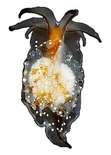 The nervous system is euthyneurous. The cerebral, pleural, and pedal ganglia form the typical molluscan pre-pharyngeal nerve ring. Each cerebral ganglion connects via a broad nerve to its corresponding labial and rhinophore tentacle, though there is no rhinophore ganglion. The animal also lacks optic ganglia and accessory ganglia. Despite the presence of eyes, there appears to be no optic nerve. The pedal ganglia each send one nerve anteriorly and two posteriorly to control the foot. These ganglia are separated by a long, thin commissure and have one statocyst and statolith each, attached dorsally. It has one subintestinal ganglion, one visceral ganglion, one osphradial ganglion, two gastro-esophageal ganglia, one left parietal ganglion, and two buccal ganglia, along with the necessary commissures and connectives.[1]