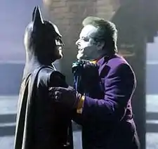 Tim Curry, David Bowie, John Lithgow, Brad Dourif, Ray Liotta, and James Woods were all considered for the Joker.[19][30][31][32] Lithgow, during his audition, attempted to talk Burton out of casting him, a decision he would later publicly regret, stating, "I didn't realize it was such a big deal."[33] Burton wanted to cast John Glover, but the studio insisted on using a movie star.[34] Robin Williams lobbied hard for the part.[20] Jack Nicholson had been the studio's top choice since 1980. Peters approached Nicholson as far back as 1986, during filming of The Witches of Eastwick;[35] unlike Keaton, he was a popular choice for his role.[27] Nicholson had what was known as an "off-the-clock" agreement. His contract specified the number of hours he was entitled to have off each day, from the time he left the set to the time he reported back for filming,[13] as well as being off for Los Angeles Lakers home games.[36] Nicholson demanded that all of his scenes be shot in a three-week block, but the schedule lapsed into 106 days.[35] He reduced his standard $10 million fee to $6 million in exchange for a cut of the film's earnings (including associated merchandise), which led to remuneration in excess of $50 million[37]—biographer Marc Eliot reports that Nicholson may have received as much as $90 million.[38] He also demanded top billing on promotional materials.[39]