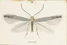 ♂︎. 8 mm. Head and thorax bronzy-whitish. Palpi with appressed scales, whitish, with faint greyish marks at apex of second joint, and base and apex of terminal joint. Abdomen grey. Forewings narrow-lanceolate, apex narrowly produced ; violet-grey, becoming darker posteriorly, produced apex blackish : cilia grey, base round apical third of wing paler and sprinkled with blackish, sometimes forming indistinct dots, at apex with a short black subbasal bar. Hindwings violet-grey ; cilia grey.[2]